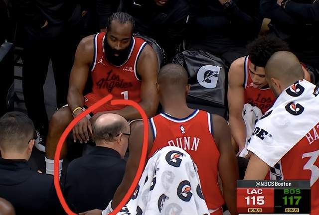 最后2秒钟,也就是说过去19秒哈登轰下9分,这个时候凯尔特人也是叫了最后的暂停。快船这边已经没有暂停,他们也是提前布置好最后一攻的战术安排,只不过主教练泰伦卢并没有拿起战术板,反而是助理教练范甘迪坐在球员面前,不断布置着。快船肯定是准备了2种方案,一种是凯尔特人两罚全中,另一种就是最后一罚故意不中。