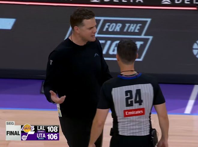 一个是在于本场的罚球数量,东契奇罚球12次,里夫斯罚球8次,再加上詹姆斯,湖人三巨头罚球22个,爵士全队的罚球一共才18个,三个人的罚球比你一个队都多,爵士队教练不爽,这是非常正常的。